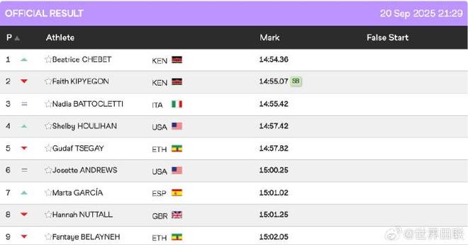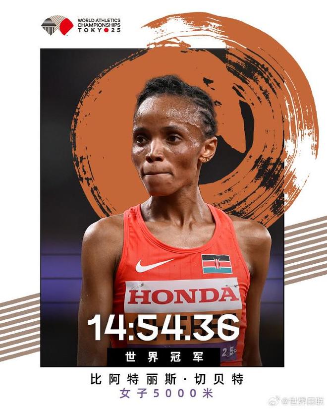 9月20日,2025年东京田径世锦赛女子5000米决赛,最后一圈又是三人决战,最终万米冠军切贝特再现无解冲刺,14分54秒36获得金牌,成为14年来首位包揽世锦赛女子5000米和10000米金牌的选手。
