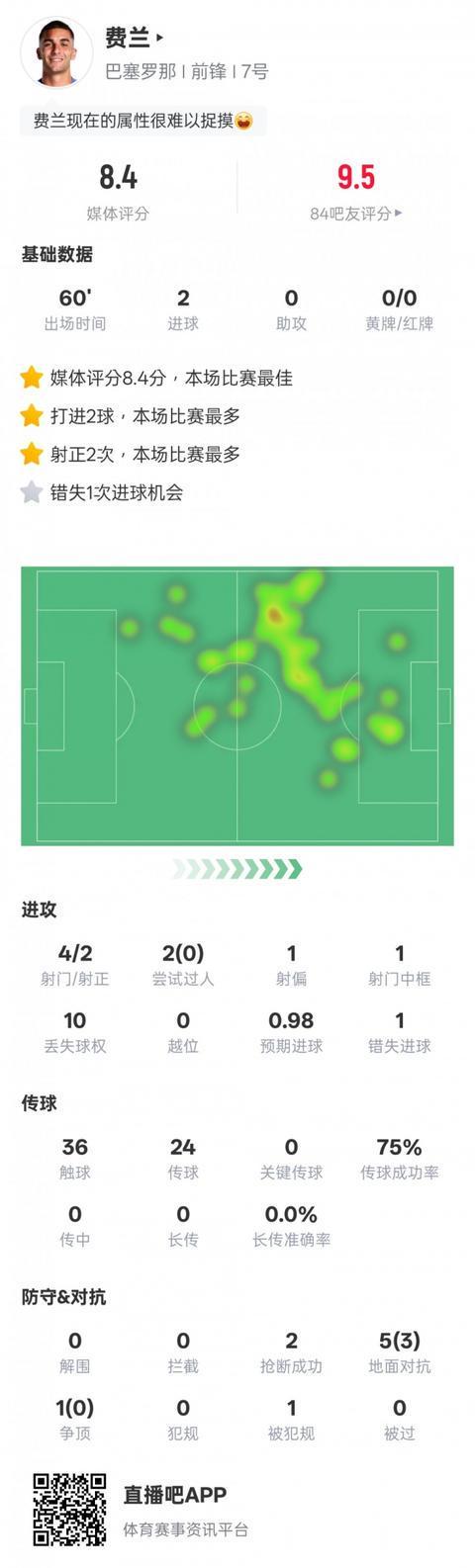 9月22日讯 2025-26赛季西甲联赛第5轮,巴萨3-0赫塔费。费兰-托雷斯首发出战,打进2球,评分8.4全场最高,赛后当选全场最佳球员。