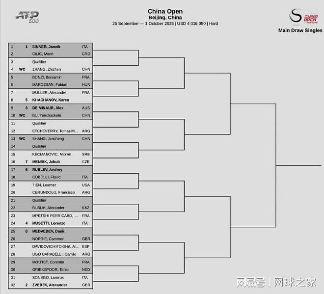 另外,北京时间昨天下午,ATP500中网签表出炉。单打前八大种子的对位:上半区,辛纳--卡恰诺夫、德米纳尔--门希克;下半区,卢布列夫--穆塞蒂、梅德维德夫--兹维列夫。参赛的三位中国球员扎堆上半区,布云朝克特首战澳洲小野兔德米纳尔,张之臻和商竣程将对阵资格赛球员。