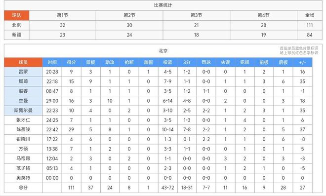作为CBA的两支传统强队,北京vs新疆的比赛结果令人意外,两人没有进行所谓的拉锯战,而是上半场就奠定了比赛的局势。第一节,北京男篮在赵睿和周琦这两位前新疆球员的带领下,以32:23领先9分,第二节,随着陈盈骏的爆发,分差进一步被拉开至15分。下半场尽管新疆男篮力求追分,但这赛季的北京阵容深度雄厚,丝毫没给新疆机会,球队最终以111:84赢下比赛。