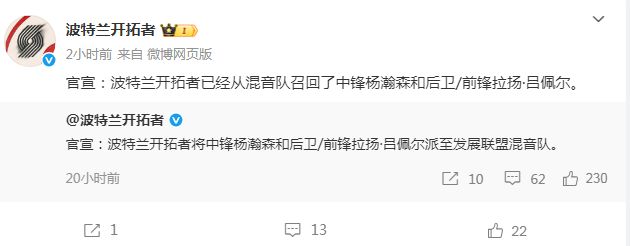 杨瀚森在比赛最后时刻贡献关键暴扣与制胜篮板,帮助撕裂之城混音主场116-110战胜斯托克顿国王,成为球队取胜的重要功臣。如今开拓者官方宣布,将杨瀚森与吕佩尔从发展联盟召回。只是开拓者下一场比赛是12月19日主场对阵国王,因而根据开拓者跟队记者Casey补充报道,他预计杨瀚森和吕佩尔在跟随开拓者完成周二(美国时间)的训练后,会被再次被下放。